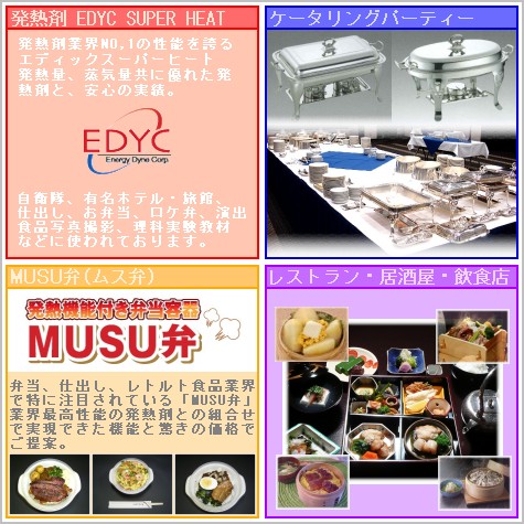 株式会社エネルダインとの業務提携により熱エネルギー源となるエデックスーパーヒート(発熱剤)を使用した「発熱機能付き弁当容器」や「かんたん湯沸し器POT」など、あらゆる生活シーンでの熱エネルギー源を供給し、用途開発・企画商品を提供して行きます。